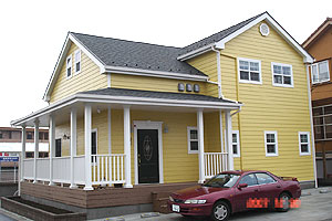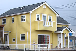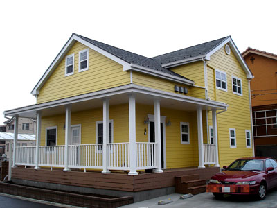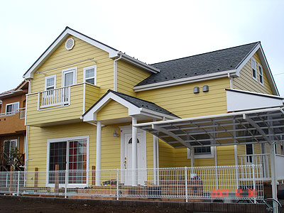 イエローのラップサイディングと一階ベランダがマッチしており、ポップであたたかみのある建物です。